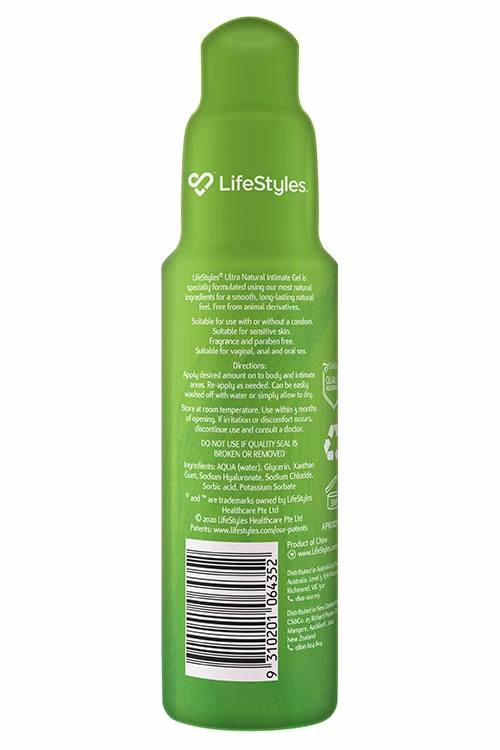Smooth, long lasting and dermatologically tested for sensitive skin, LifeStyles Ultra Natural Intimate Gel is water based and specifically formulated from natural ingredients to give you body safe, longer lasting lubrication.Â